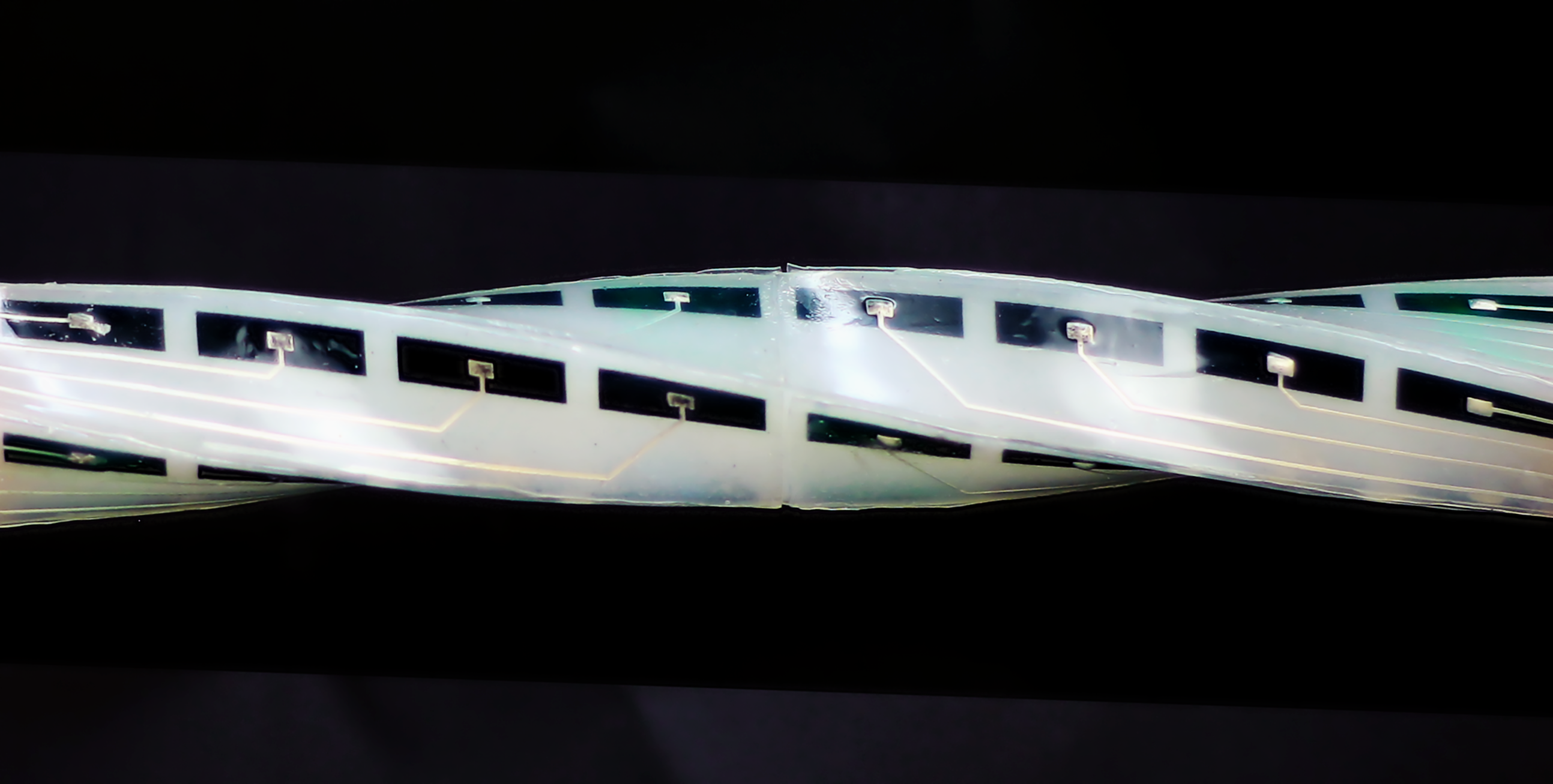 Researchers created a flexible e-skin made of a thin layer of silicone embedded with wires and sensitive detectors. Using the e-skin – which is 1mm thick – in combination with artificial intelligence, researchers were able to give soft robots the ability to rapidly sense their motions and deformations with millimetre accuracy in three dimensions, in real time.